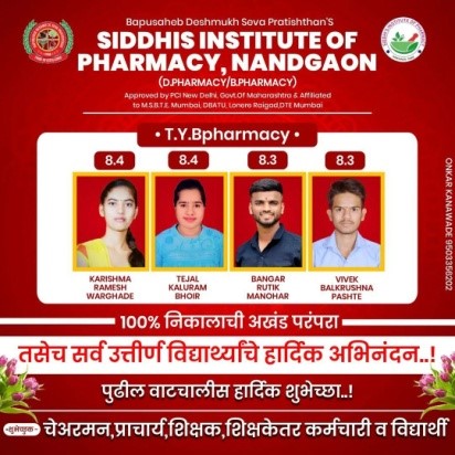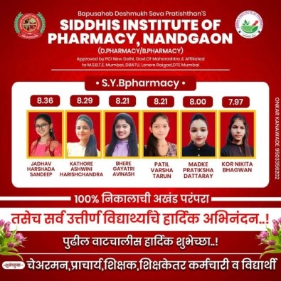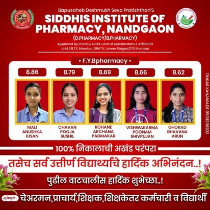 Bapusaheb Deshmukh Seva Pratishthan (BDSP’s) under the Bombay Public Trusts Act 1950 (Reg.No.F/46443,Pune) and a Society registered under the Societies Registration Act 1860 (Reg. No.MH/578,Pune) having its registered office at katraj,Pune - 411046 in the state of Maharashtra, India. BDSP’s Moto : “Pride in Excellence”. BDSP has proposed to start Siddhi's Institute of Pharmacy at post Nandgaon, Tal- Murbad, Dist- Thane, Maharashtra, 421401